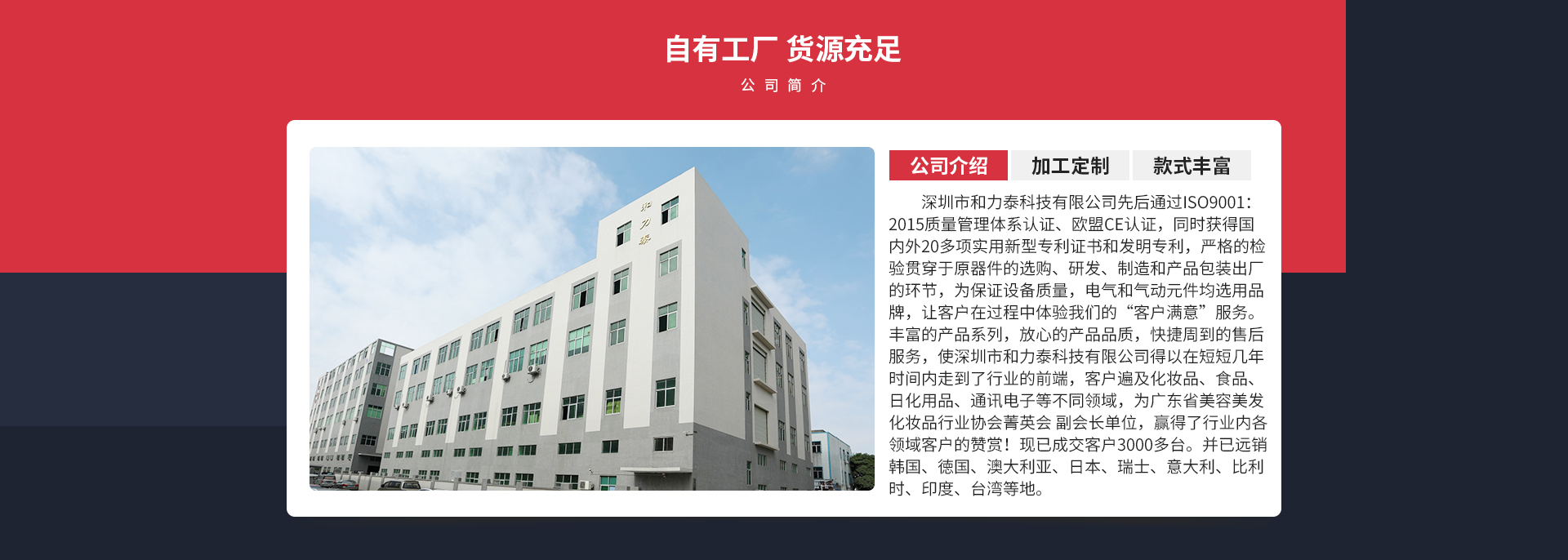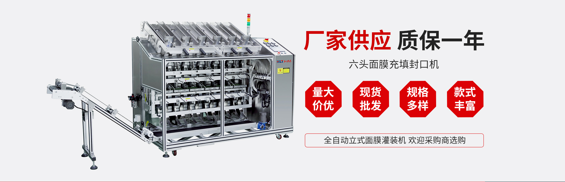 和力泰面膜灌裝封口機是立式面膜灌裝機唯一有專利的生產廠家,和力泰面膜灌裝機從最初的4頭面膜灌裝機,逐步延伸到六頭面膜灌裝封口機、八頭面膜灌裝封口機、十頭面膜灌裝封口機和眼膜領域,并在面膜眼膜灌裝、封口和包裝市場占據很重要的位置,為化妝品生產縮減人工、提高產量、減少空間等做出貢獻。