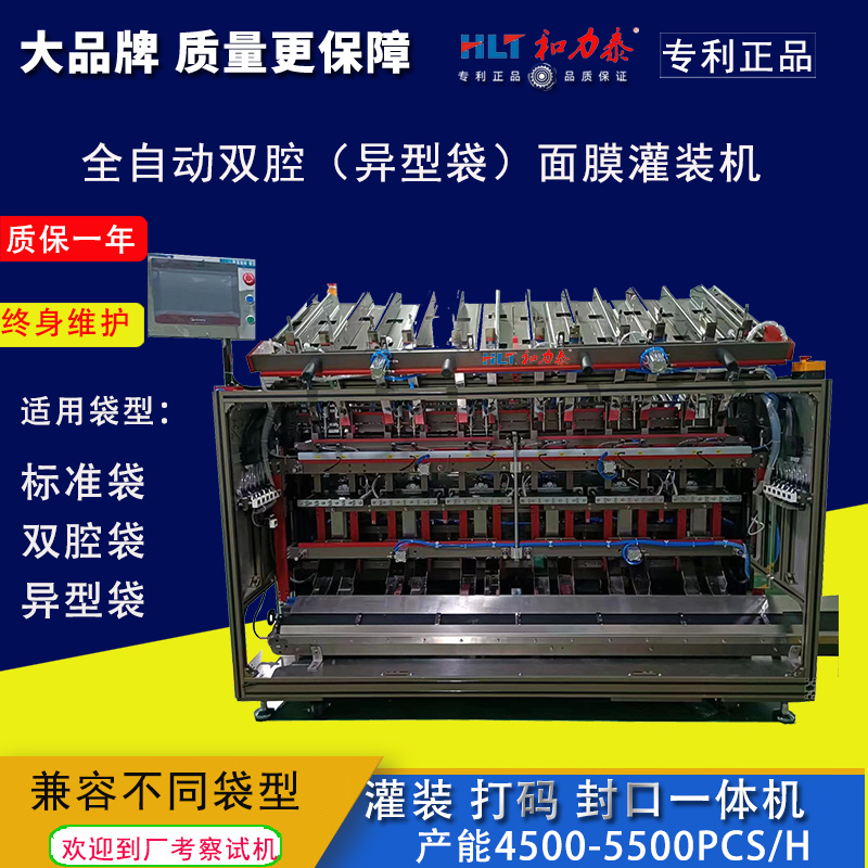 和力泰立式雙腔異型袋面膜灌裝壓碼打碼封口一體機