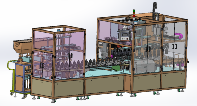 人工上瓶—自動吹瓶—自動灌裝—半自動送蓋—自動鎖蓋—自動稱重—自動輸出